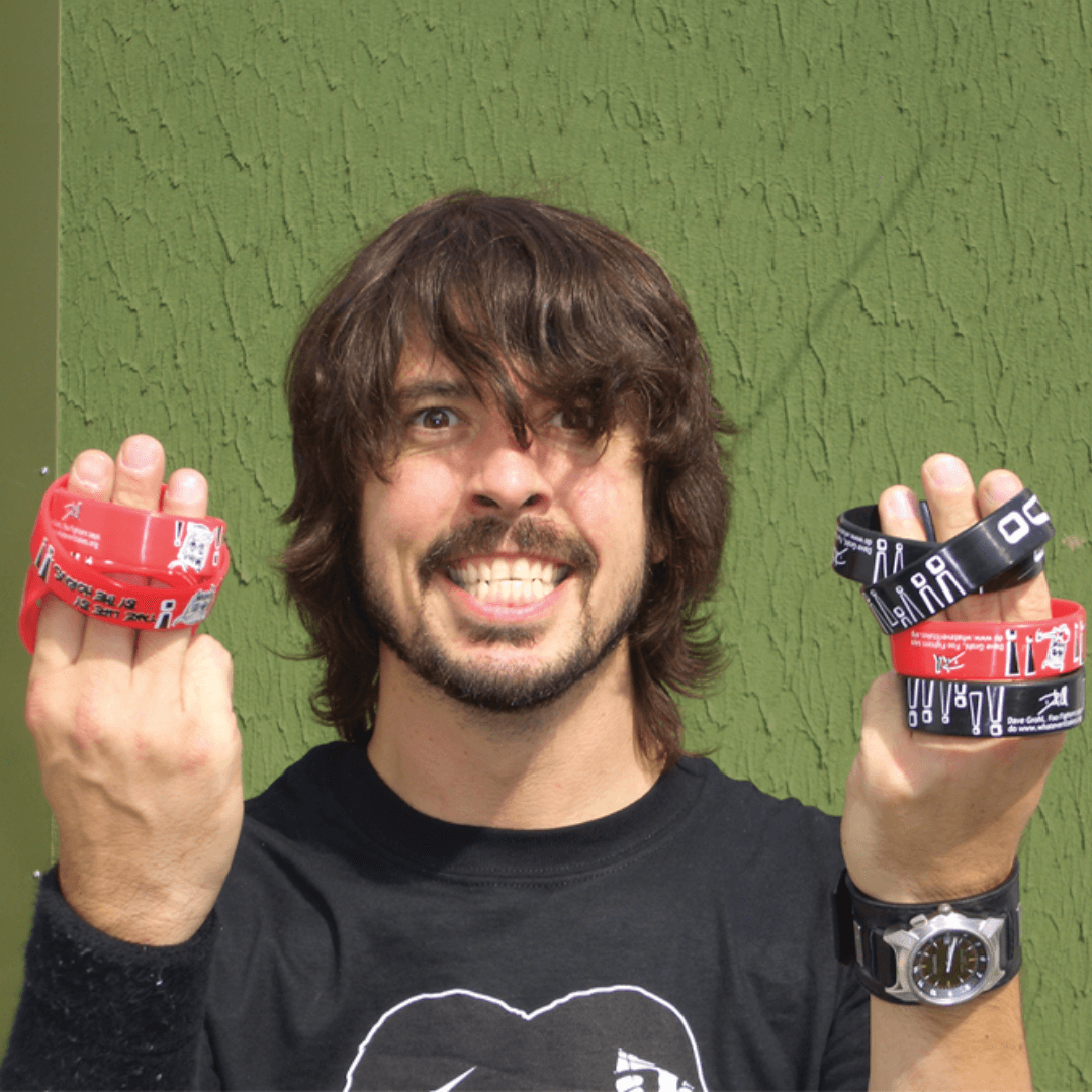 21st Century Leader Dave Grohl, Foo Fighters frontman, poses with Whatever It Takes charity wristbands decorated with his artwork.