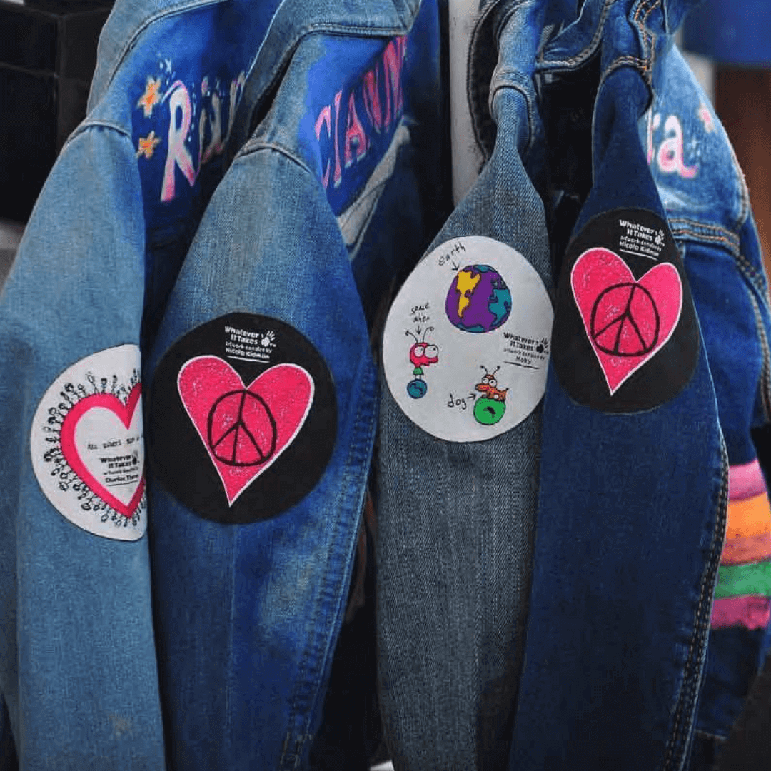 Selection of Whatever It Takes celebrity designed patches, with artworks donated by 21st Century Leaders Charlize Theron, Nicole Kidman AC and Moby.
