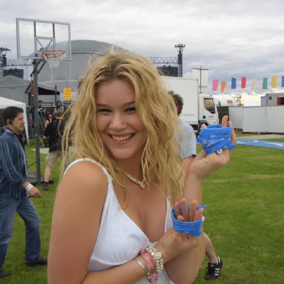 Joss Stone poses with Whatever It Takes charity wristbands decorated with her artwork, at T in the Park Festival.