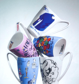 Selection of Whatever it Takes celebrity designed mugs, with artworks donated by 21st Century Leaders David Bowie, Gwen Stefani, Phil Collins LVO, Coldplay and Ronnie Wood, Rolling Stones.
